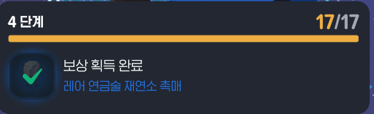 각 미션별로 보상이 있지만, 역시 핵심 보상은 단계를 완성했을 때 얻을 수 있는 연금술 재연소 촉매가 아닐까 싶습니다.