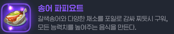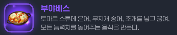 기본적으로 음식을 먹었을 때 모든 스탯 +85의 효과를 제공하고,