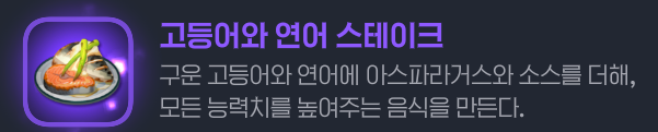 또 고등어는 특수효과의 지속시간이 5분인 반면, 농어는 10분이라 효과가 역전되는걸 고려해도 효과 지속까지 고려하면 농어 매운탕의 범용성이 좋아보이네요.