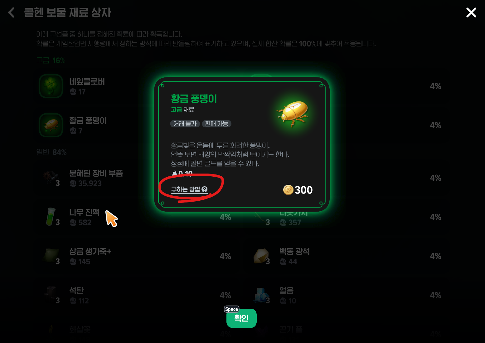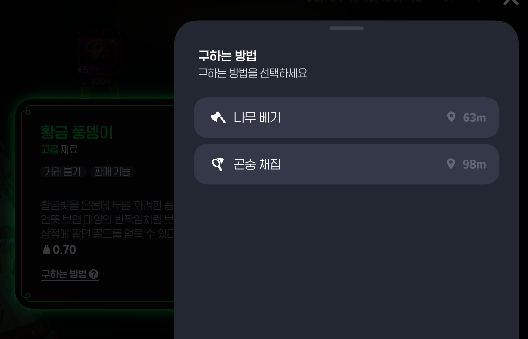 황금풍뎅이는 가지고 있지 않더라도 모험일지 도감 지원품 - Lv11달성보상 콜헨 보물 재료 상자 - 구성품 정보 - 황금풍뎅이 - 구하는 방법 을 통해 채집을 걸 수 있다.