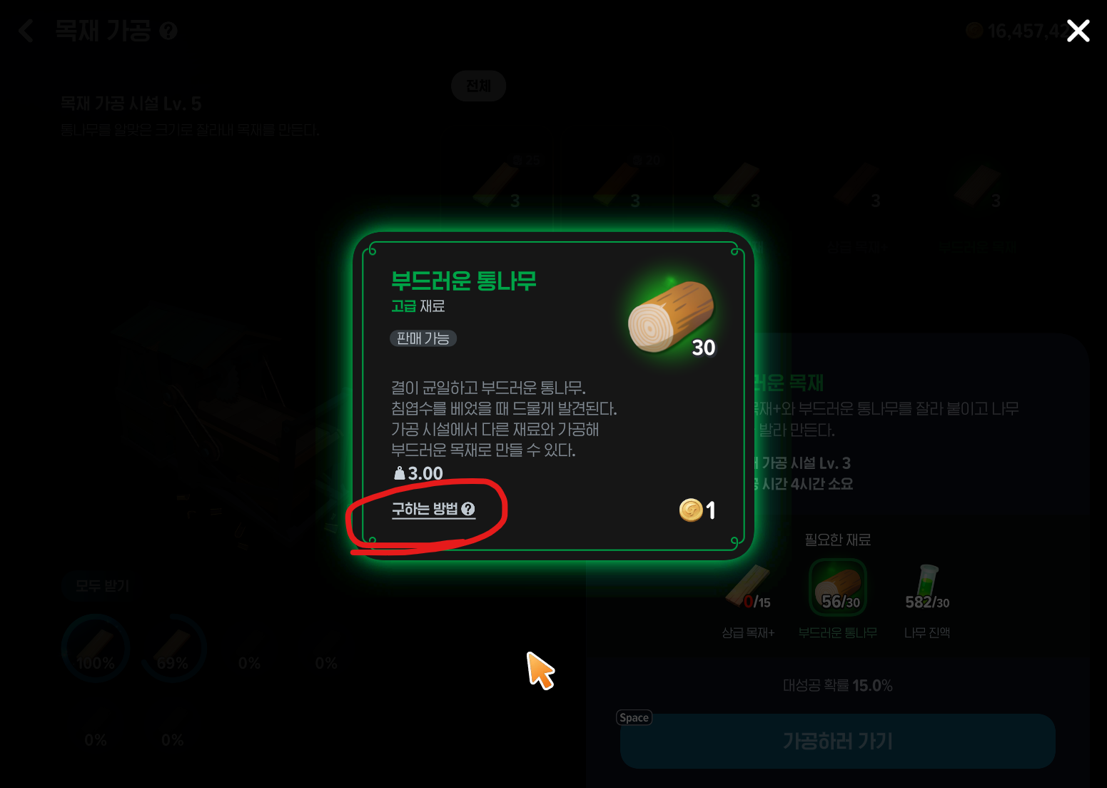 부드러운 통나무가 없다면 가공-목재가공-부드러운 목재 - 부드러운 통나무 - 구하는 방법 으로 채집을 걸 수 있다.