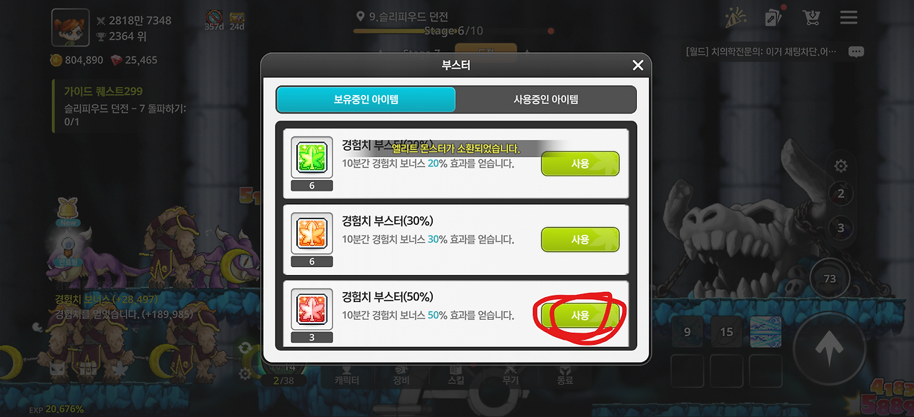 내 캐릭터는 쉬지 않고 사냥을 하기 때문에 효율을 최대화 하기 위해서 경험치 부스터를 써줍니다.