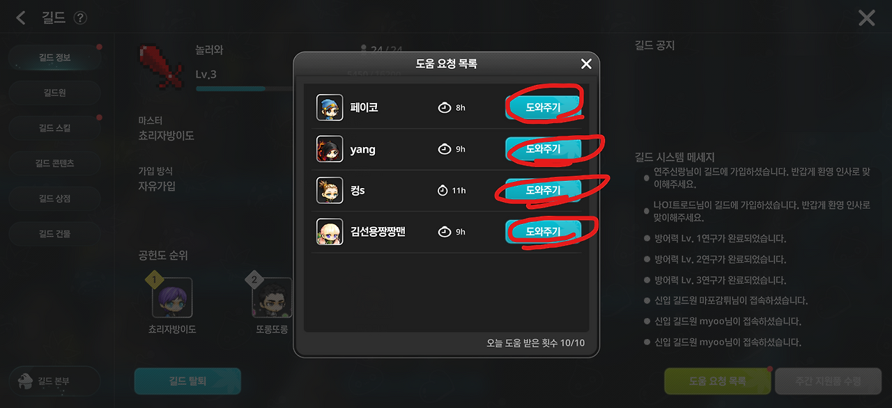 길드에 가입했다면 길드원의 도움 요청을 들어줄 수 있습니다.