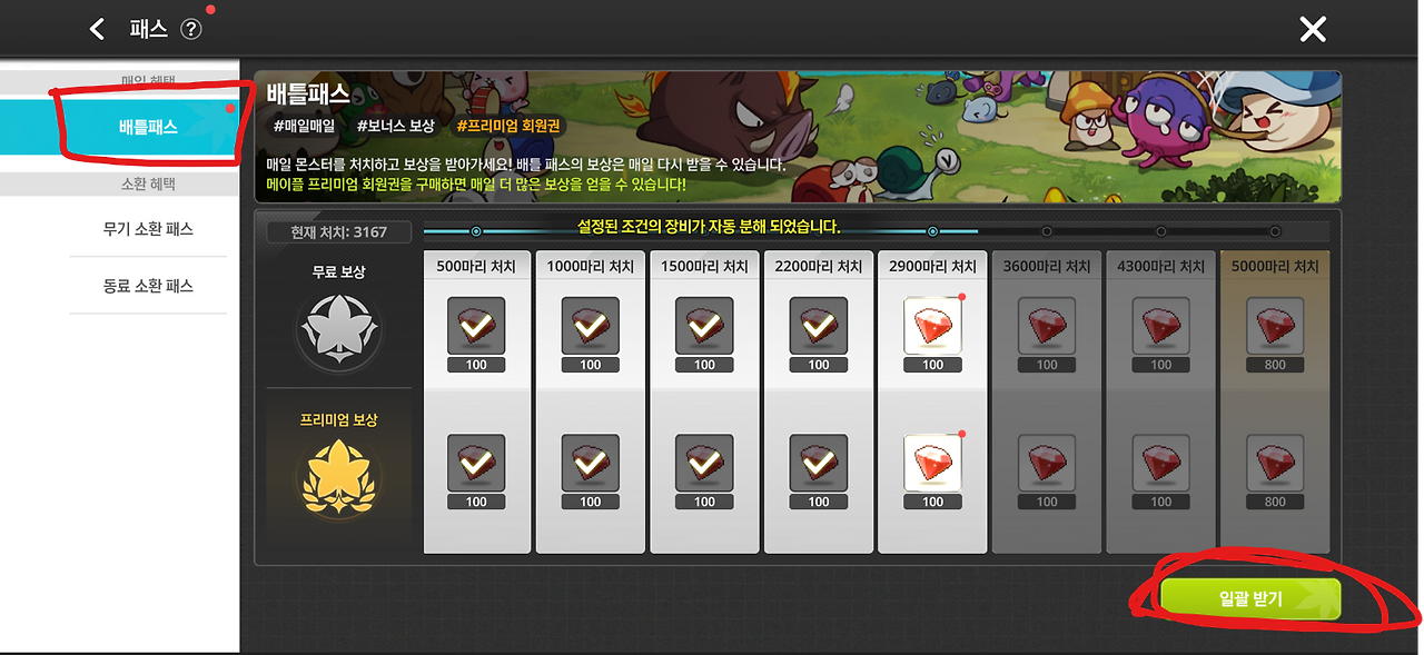 매일 배틀패스에서 주는 레드 다이아를 놓치면 안됩니다.