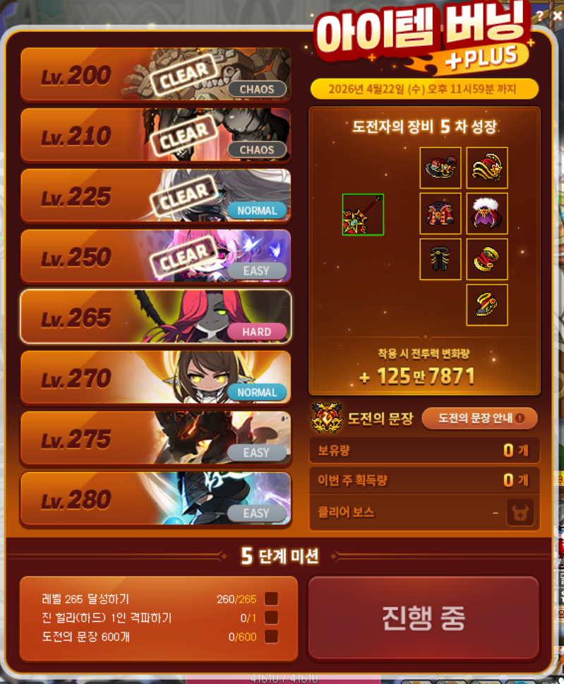 버닝 비욘드로 270까지 1+1 레벨업을 지원해줍니다.