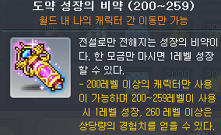 메이플스토리의 도약 성장의 비약(도성비)은 259 이하에서 1레벨을 올려주는 아이템입니다.