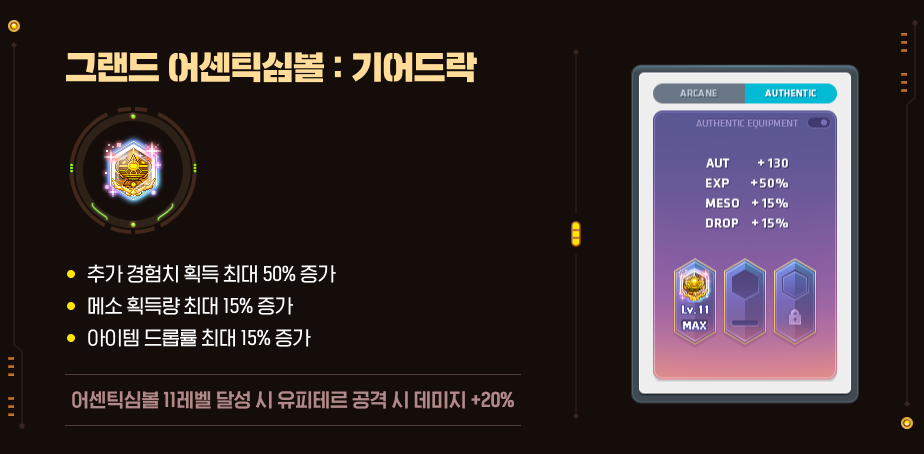그랜드 어센틱 심볼은 주스탯은 주지 않고 추가 경험치, 아이템 드롭률, 메소 획득량 상승 효과를 제공합니다.