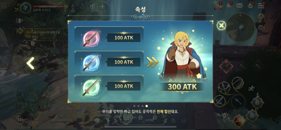 속성이 다른 무기를 껴도, 무기별 기본 공격력은 모두 적용되는데, 속성은 선택된 무기만 적용된다.