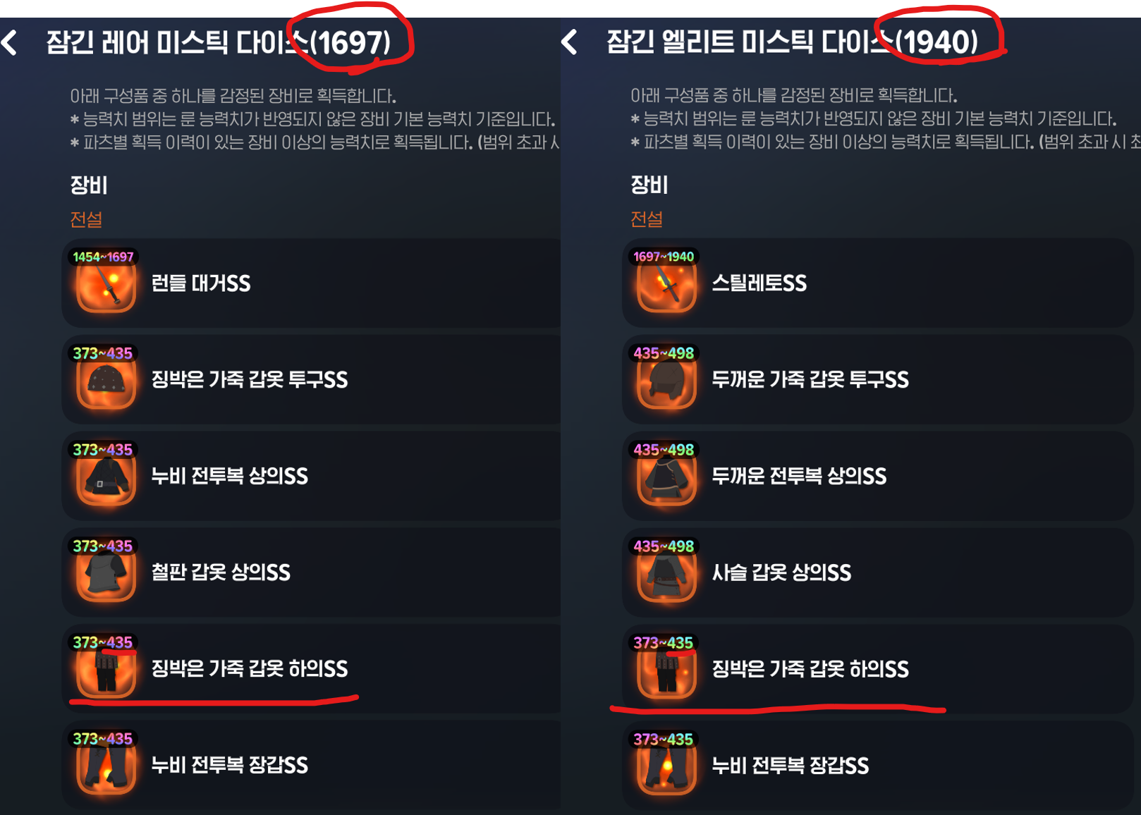 다이스를 까려고 봤는데, 하위 등급이랑 상위등급 다이스의 아이템 등장 확률 뒤에 숫자가 같으면 까면 안됨