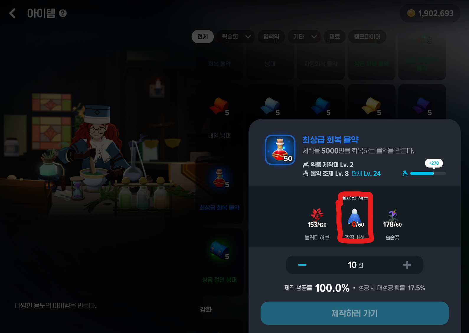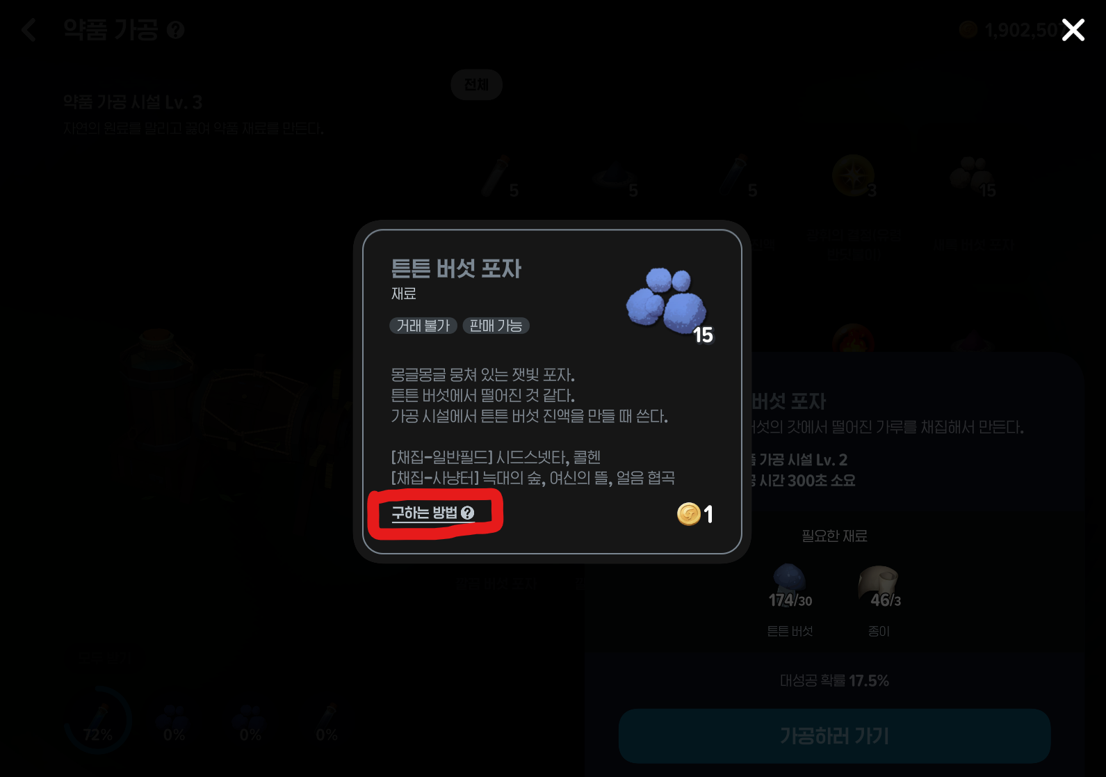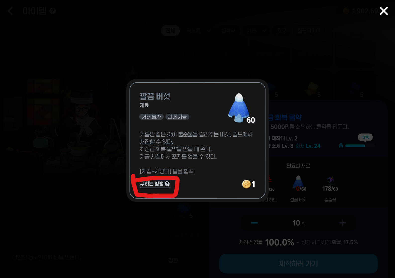 레어 도구 장착한 상태로 제작 - 아이템 - 최상급 회복 물약 10회 설정 - 구하느 방법 - 깔끔버섯