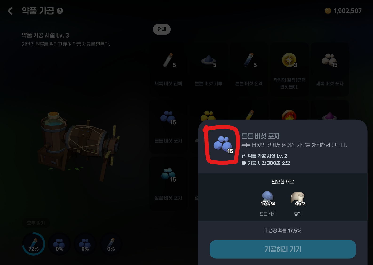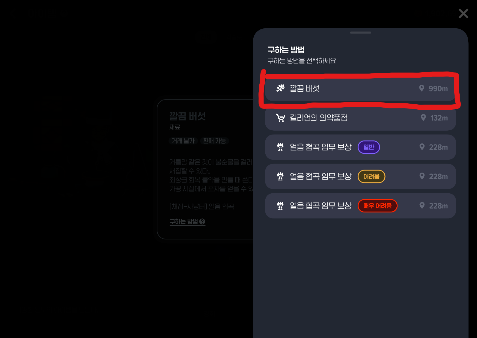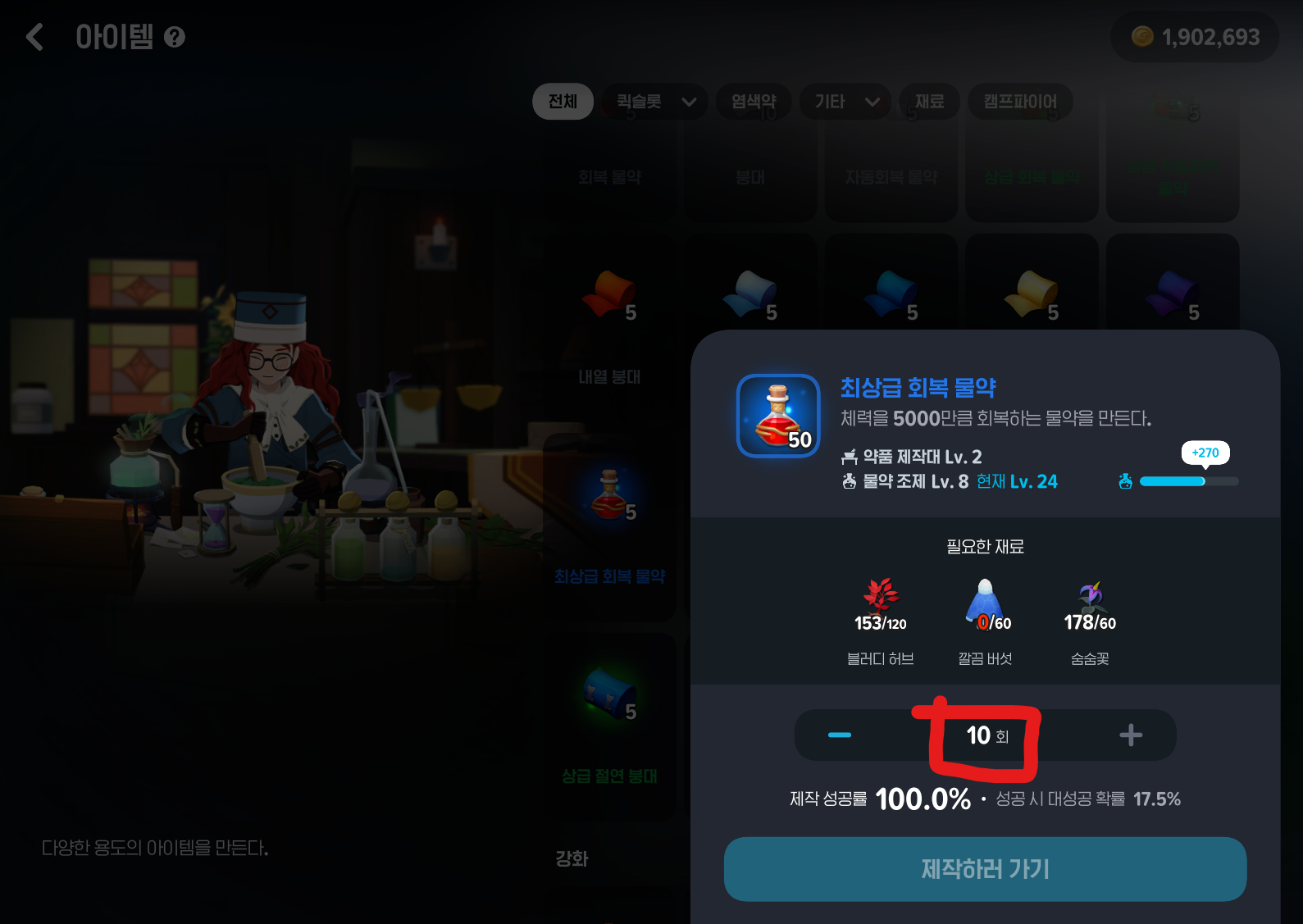 레어 도구 장착한 상태로 제작 - 아이템 - 최상급 회복 물약 10회 설정 - 구하느 방법 - 깔끔버섯