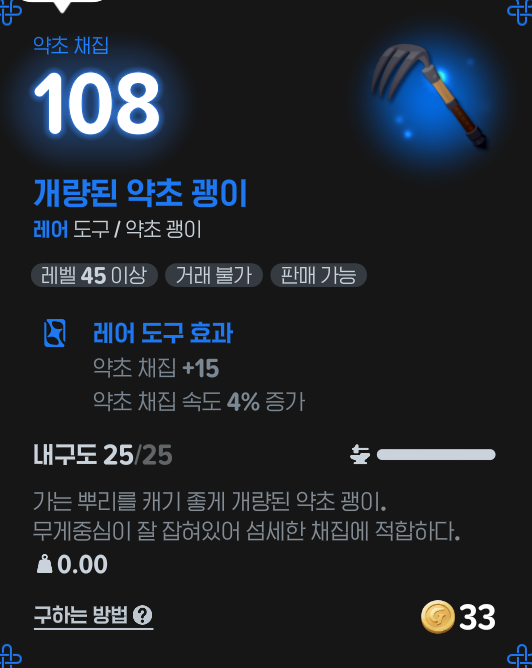 대신 위에서 얘기한 것처럼 상대적으로 확률이 낮은거라, 레어리티가 높은 도구를 끼고 채집하면 생각보다 빠르게 채집이 종료될 수 있다.