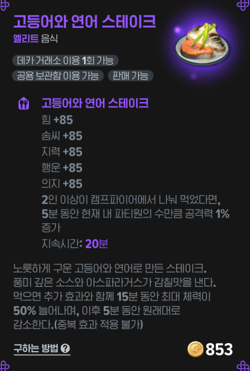 현 시점 기준에서 고등어와 연어 스테이크의 쉐어링 효과가 다른 음식들보다 효율이 좋아서 가장 선호되고 있다.