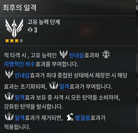 타격 시 인내심 스택 부여 -> 스택 30개 됐을 때 재장전 하면 일격 발동 -> 일격으로 한방딜